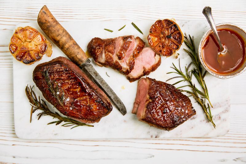- Lisää pannulle rosmariini ja halkaistu valkosipulin pää, käännä ankat ja ruskista lihapuolelta.