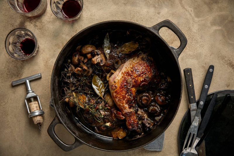 - Kaada päälle lihaliemi ja viini. Lisää lopuksi yrtit. Hauduta kannen alla puolisen tuntia.