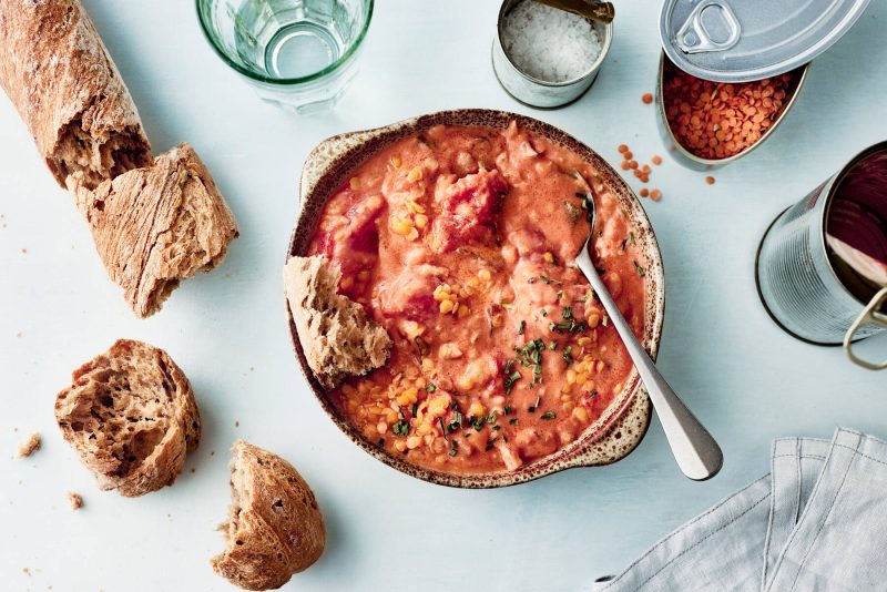 - Lisää joukkoon säilyketomaatit, huuhtele tölkit tilkkasella vettä. Lisää myös linssit, ruokakerma ja liemikuutio. Anna kiehua hiljalleen kannen alla 5 min. Jos käytät kuivattuja linssejä, huuhtele ne siivilässä ennen lisäämistä ja tarkista pakkauksesta kypsymisaika. Kuivatut linssit eivät sisällä suolaa, joten käytä silloin kokonainen liemikuutio ruokaan.