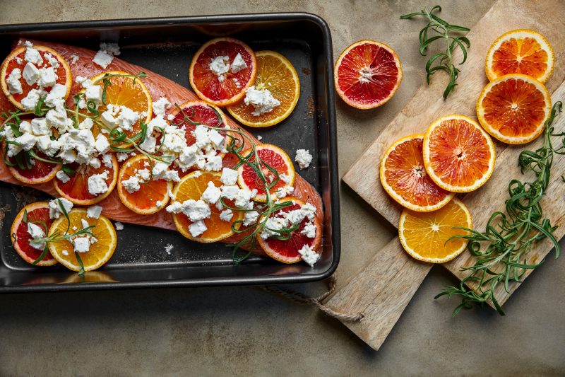 Uunilohesta saa poikkeuksellisen mehevää kuorruttamalla lohen appelsiiniviipaleilla. Voit käyttää ruoassa oman makusi mukaan veriappelsiineja, tavallisia appelsiineja tai niiden sekoitusta. Lohi viimeistellään rosmariinilla ja salaattijuustokuutioilla, jotka tuovat annokseen sopivaa suolaisuutta appelsiinien makeutta tasapainottamaan.