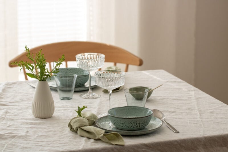 Lautasliinoilla on helppo tuoda väriä pääsiäispöytään. Esimerkiksi vihreät, keltaiset tai violetit paperiservetit voi taitella kauniiseen muotoon lautasten viereen tai sitoa rullalle langanpätkällä. Kangasservetit näyttävät tyylikkäiltä aina, myös rennosti lautasen viereen taiteltuna. Voit viimeistellä servetin pujottamalla sen sisään esimerkiksi pajunoksan tai leikkokukan.