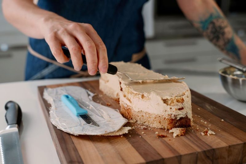 Jatka viilentyneen kakun muotoilua leipäveitsen avulla, kunnes olet tyytyväinen muotoon. Päällystä kakku jämäkällä suklaakreemillä kauttaaltaan.