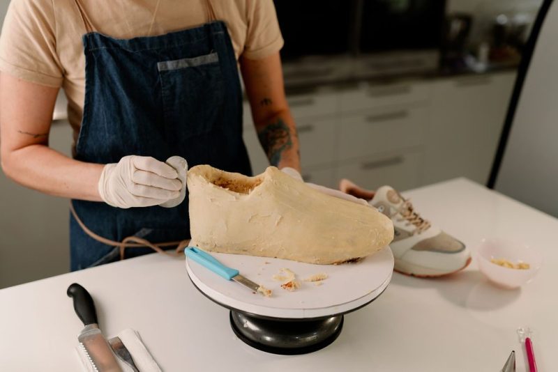 Täytä muotoon leikatut pohjat levittämällä kerrosten väliin suklaa- tai voikreemiä. Aseta sitten pahvista leikattu kengän sivuprofiili kakun viereen. Leikkaa sahalaitaista leipäveistä apuna käyttäen ylimääräinen kakkumassa pois. Siirrä vielä hieman laatikkomainen kenkäkakku asettumaan jääkaappiin muutamaksi tunniksi.