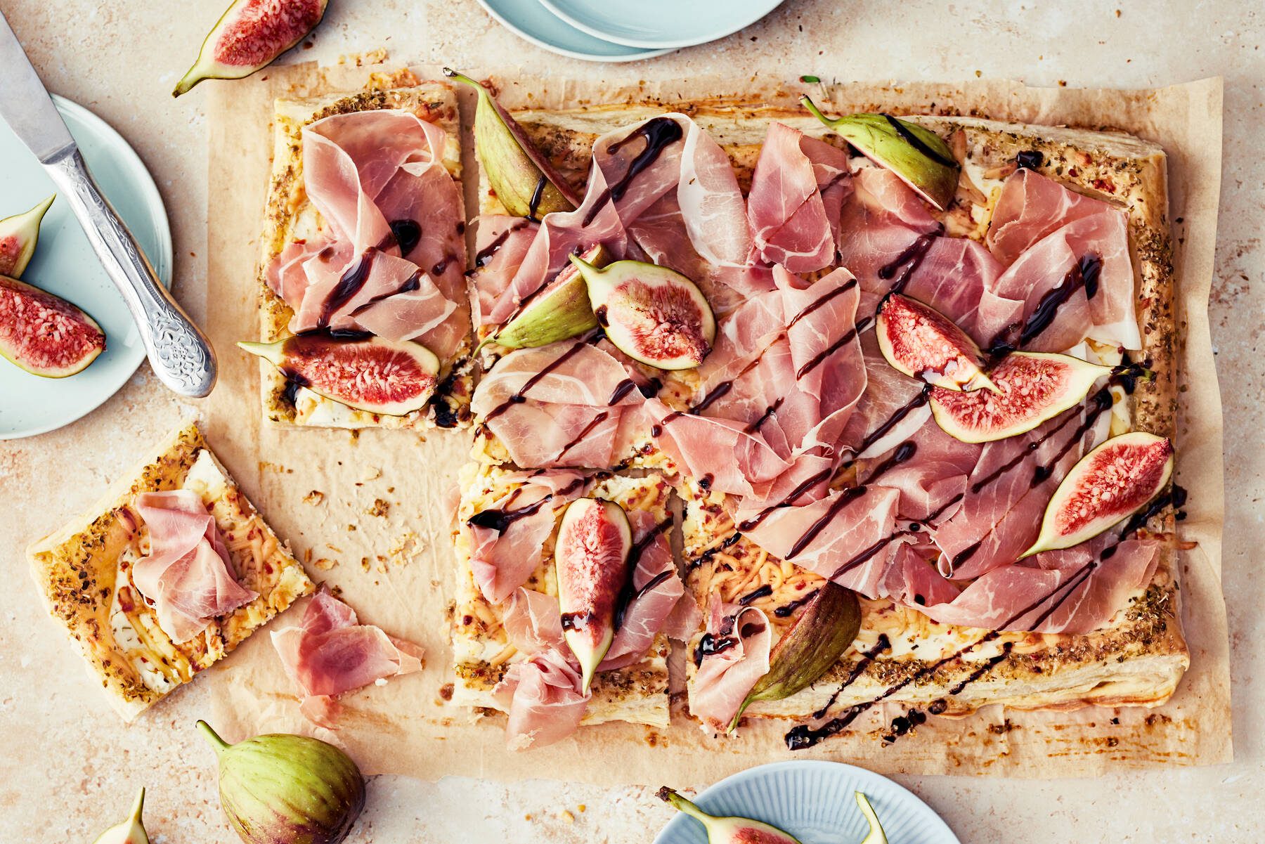 Kinkkupiirakka on toinen hurmaavan helppo voitaikinaherkku, joka katoaa juhlahumussa satavarmasti vieraiden suihin. Ihanan juustoinen pohja paistetaan ensin uunissa, minkä jälkeen päälle kasataan rennolla otteella ilmakuivattua kinkkua, tuoreita viikunoita ja balsamicoa. Makumaailma vie ajatukset aurinkoiseen Italiaan.
