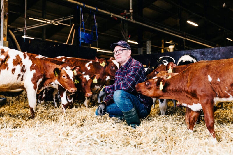 Likolahden tilan isäntä, Valion hallintoneuvoston puheenjohtaja Mikko Heikkinen saapuu haastatteluun suoraan navetasta. Navetassa on yhteensä noin 200 lypsylehmää.