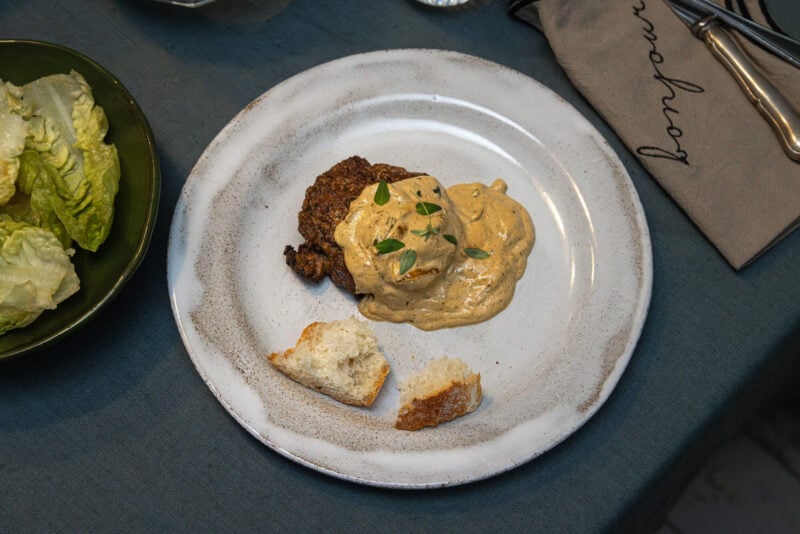 Pihvit paistetaan sipulien kanssa samalla pannulla ja kun pihvit ovat kypsyneet, ne nostetaan sivuun lepäämään. Sipuleista syntyy pannulla nesteen, crème fraîchen ja mausteiden kanssa täyteläinen kastike. Pihvien kanssa maistuu simppeli, vinegretillä viimeistelty vihersalaatti.