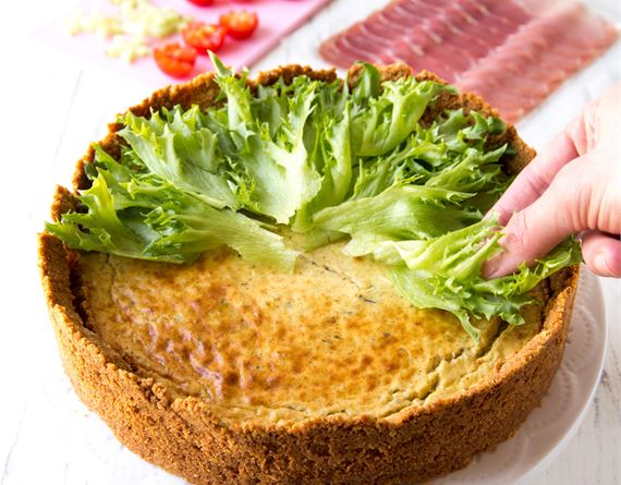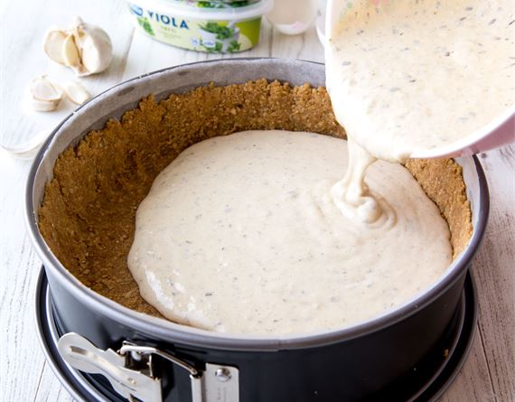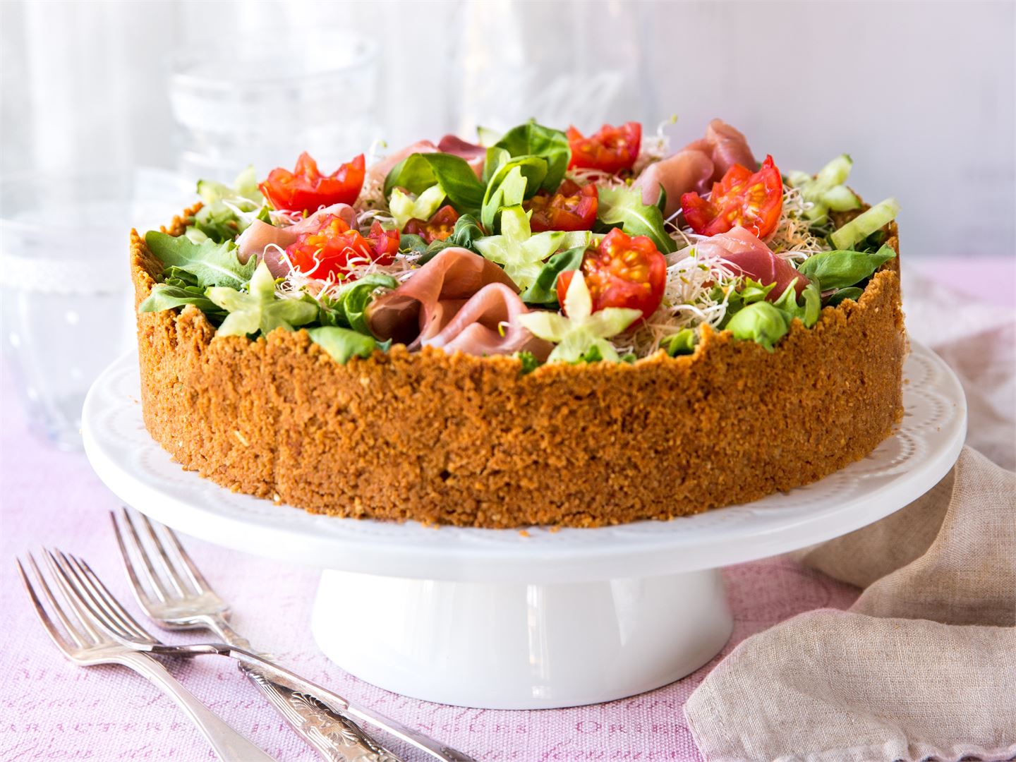Suolainen juustokakku tarjoillaan kylmänä ja se kannattaakin valmistaa jo tarjoilua edeltävänä päivänä. Juustoisen täytteen päälle rakennetaan kakun toinen pääelementti eli raikas ja runsas salaatti. Tätä leivonnaista voisikin nimittää myös salaattikakuksi, jossa tuoreet kasvikset tarjoillaan juhlavasti. Voit kokeilla täytteessä muitakin Valio Viola® tuorejuustojen makuja yhdistellen erilaisiin salaattiaineksiin.