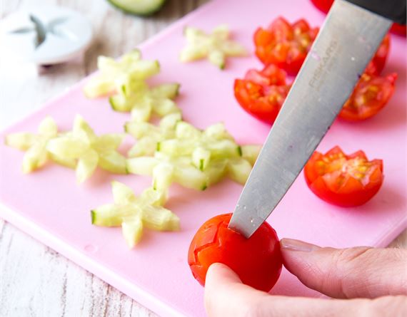 Vaihe 7: Kurkkuviipaleista on leikattu kukkia muotin avulla ja tomaatit halkaistu pistelemällä veitsellä keskiosaan saakka ulottuvaa siksak-kuviota. Lopuksi päälle on aseteltu ilmakuivattua kinkkua ruusukkeina.