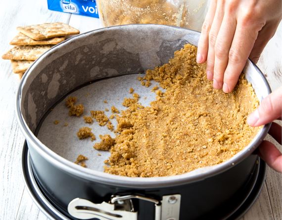 Vaihe 1: Vuoraa irtopohjavuoan (halkaisija 24 cm) pohja leivinpaperilla. Leikkaa myös reunojen suojaksi leivinpaperisuikaleet. Saat leivinpaperit pysymään reunoissa kiinni, kun sipaiset reunaan kevyesti voita tai öljyä.