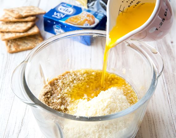 Vaihe 2: Murskaa voileipäkeksit tehosekoittimessa. Sulata voi. Yhdistä keksimurska, voisula ja juustoraaste. Jos raastat juuston itse, käytä raastimen pienintä terää, jotta saat hyvin hienon raasteen