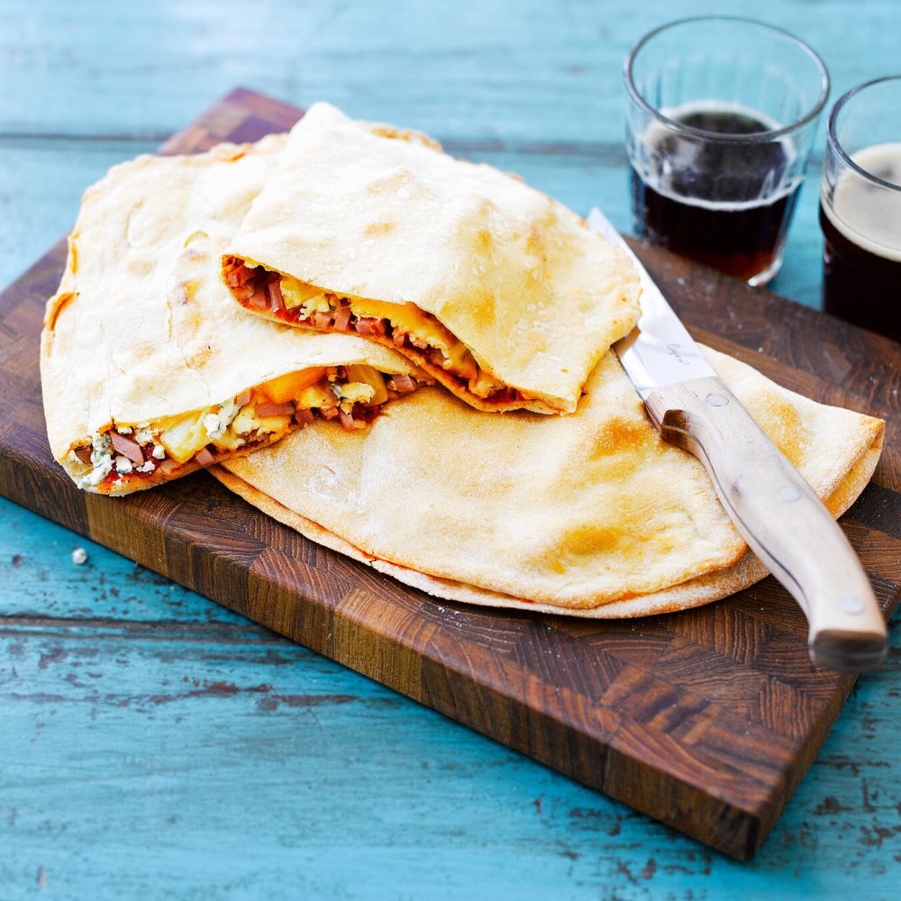 Calzone on täytetty pizza, jossa täytteet on leivottu pizzan sisään.