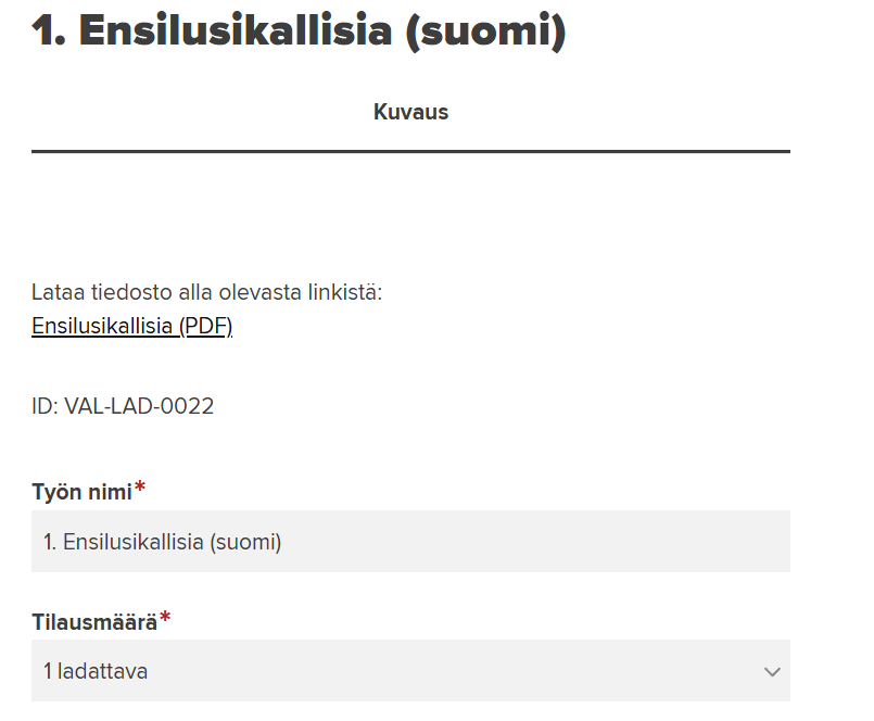 Ladattavat materiaalit ovat ladattavia PDF-tiedostoja. Voit avata haluamasi tuotekortin klikkaamalla ”Avaa tuotevalinnat” painiketta tuoterivillä. - Avautuvalta tuotekortilta voit avata tiedoston klikkaamalla tiedoston nimeä.