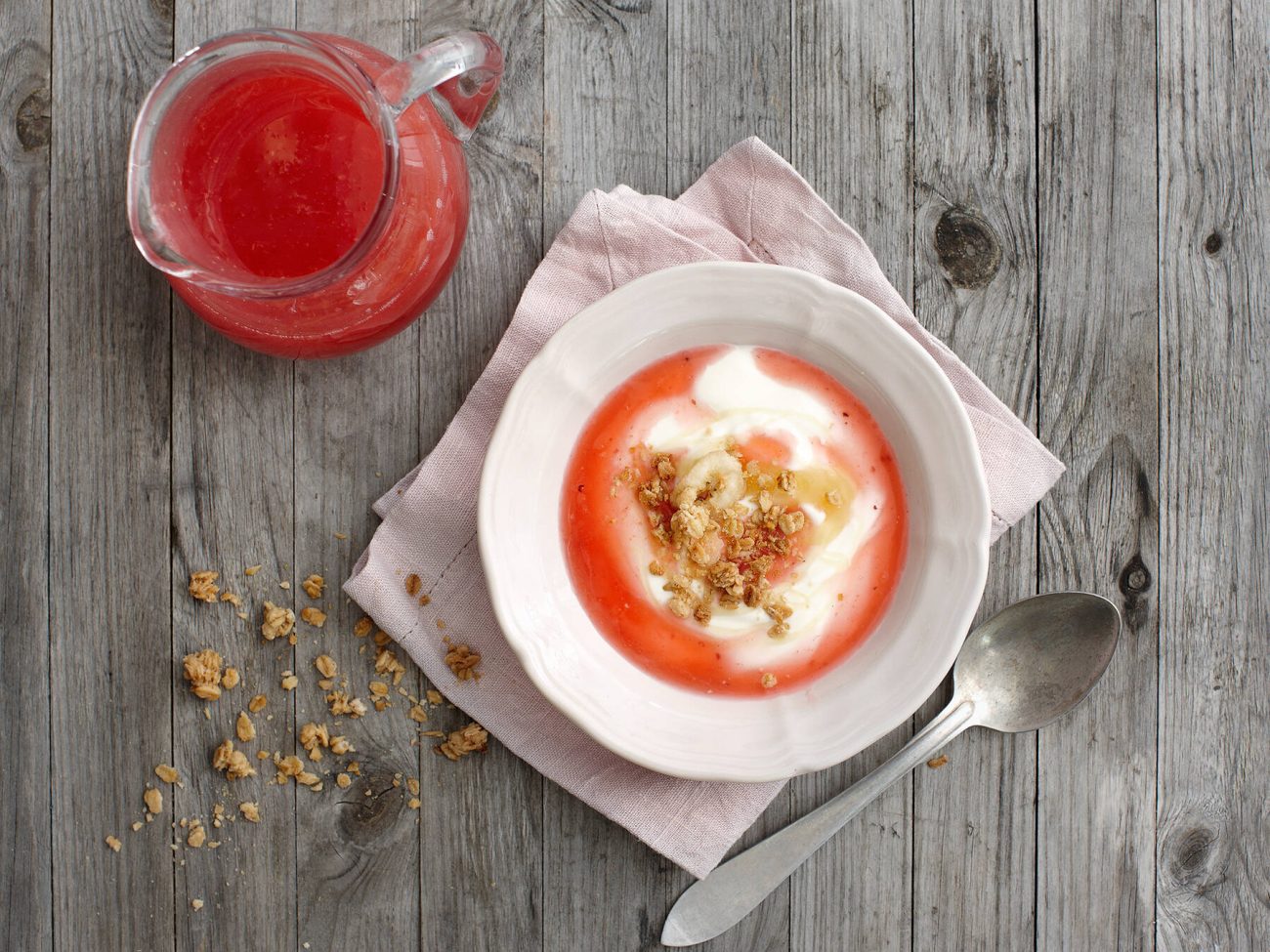 - Kaada kulhoon jogurtti. Lisää marjakeitto. Ripota pinnalle mysliä tai leseitä.