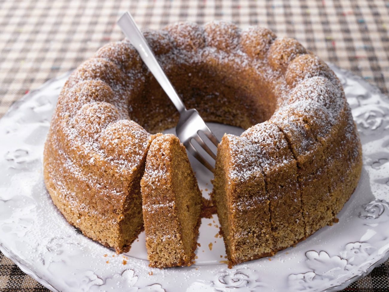 - Paista 175 asteessa 50 - 60 min. Peitä tarvittaessa leivinpaperilla paiston loppuvaiheessa, jotta pinta ei tummu liikaa. Anna kakun jäähtyä hetki ennen kumoamista.
