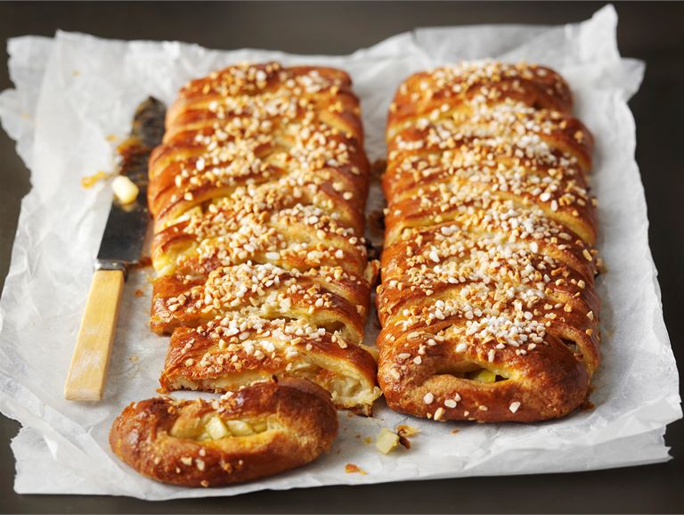 - Leikkaa reunoille jäävä taikina parin cm:n levyisiksi nauhoiksi. Nosta taikinanauhat täytteen päälle vuorotellen ristikkäin.