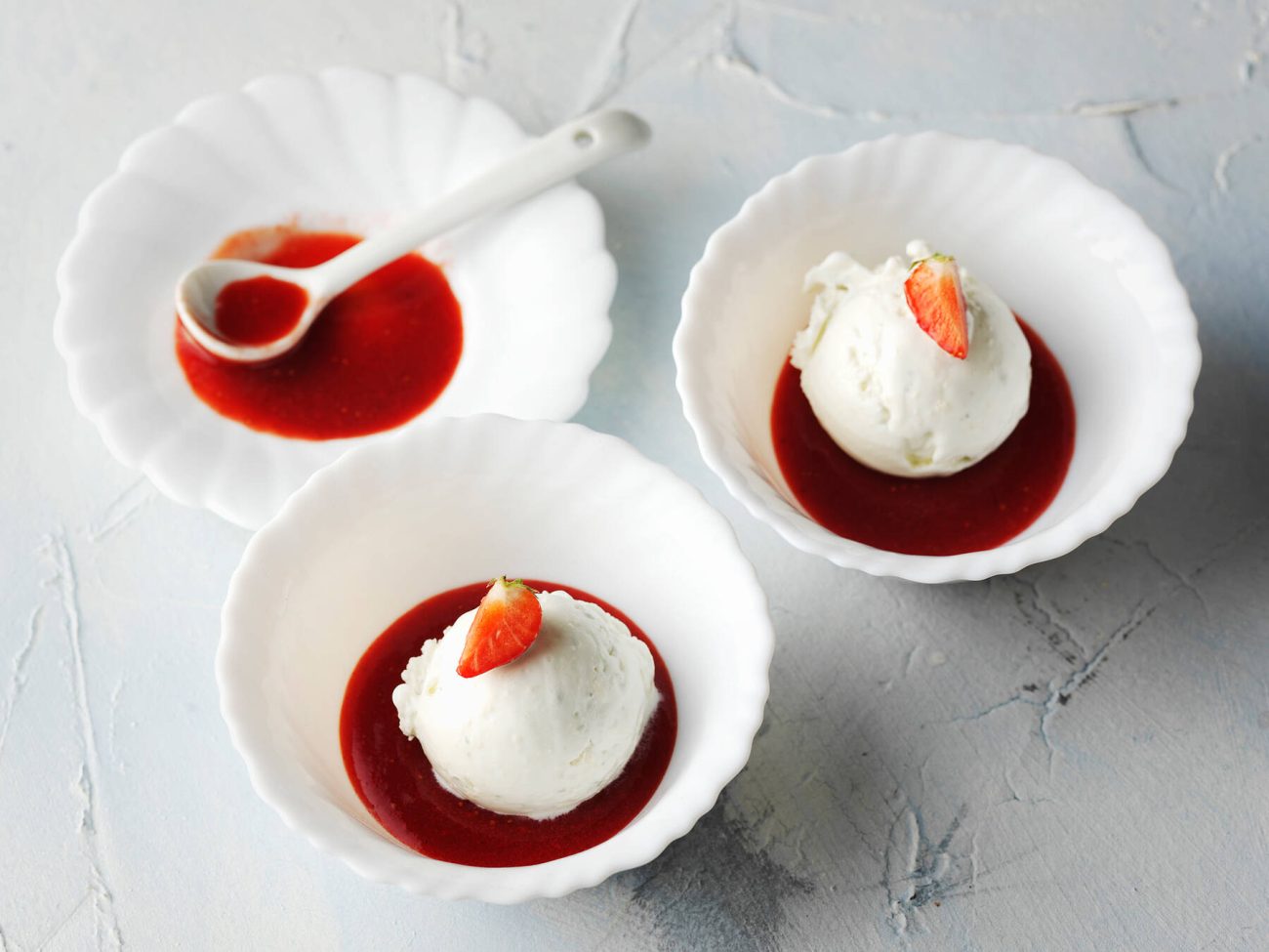 - Ota jäätelö pehmenemään ja pyöräytä siitä jäätelöpalloja. Tarjoa mansikkakastikkeen kanssa.