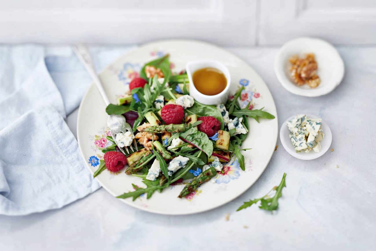 - Levitä salaatti vadille. Kerrostele päälle parsa, AURA paloina, saksanpähkinät ja vadelmat.