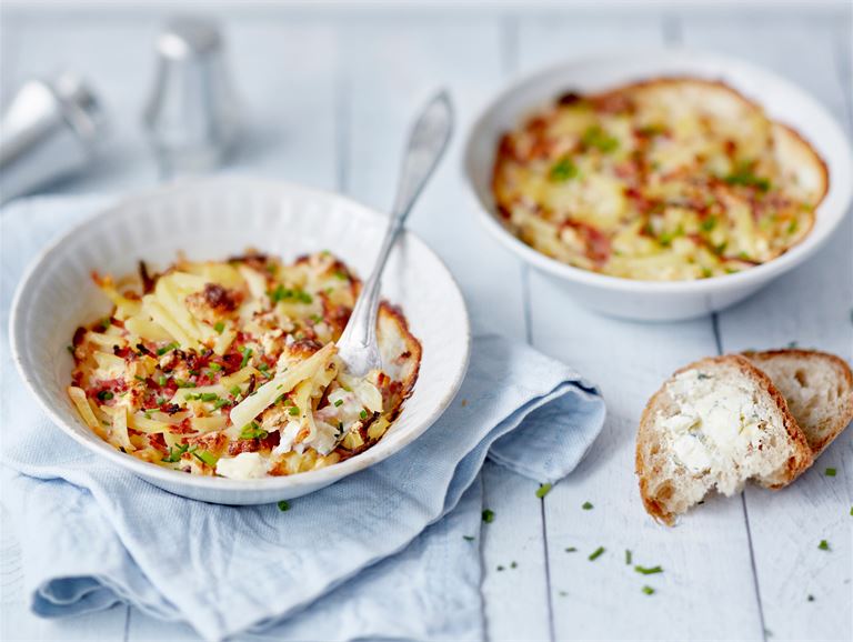 - Sekoita uunivuoassa peruna-sipulisekoitus ja kinkkusuikaleet.
