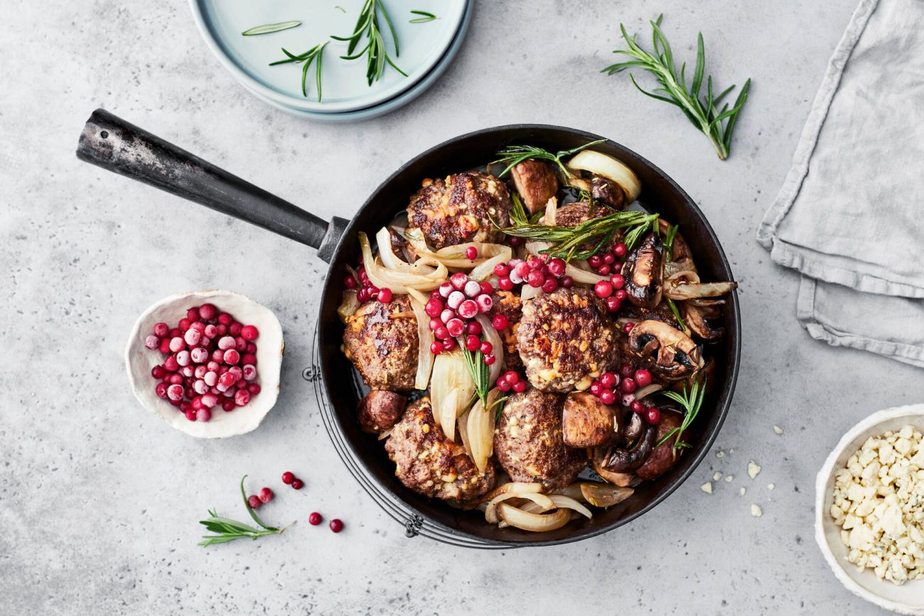 - Sekoita jauhelihaan AURA muru, muutama kierros mustapippuria myllystä sekä suola. Muotoile massasta 8 isoa lihapullaa ja paista pannulla Oivariini rasvassa. Lisää pannulle pullien päälle sipuli-sieniseos ja laita kansi tai folio päälle. Miedonna lämpöä ja jatka paistamista kunnes pullat ovat kypsiä.