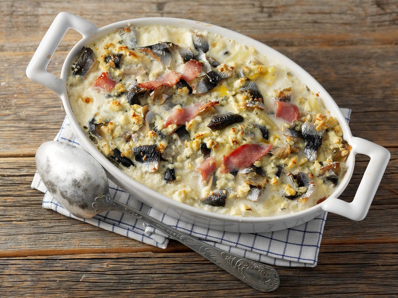 - Sekoita maitoon munat ja AURA. Kaada vuokaan.