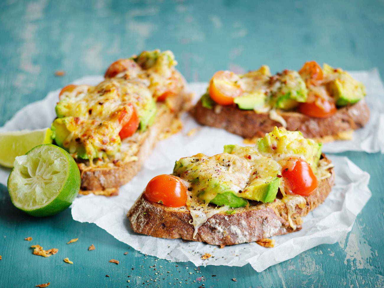 - Viipaloi avokado ja puolita tomaatit. Levitä avokadoviipaleet leipien päälle, mausta limemehulla ja suolalla. Ripottele puolet juustoraasteesta päälle.