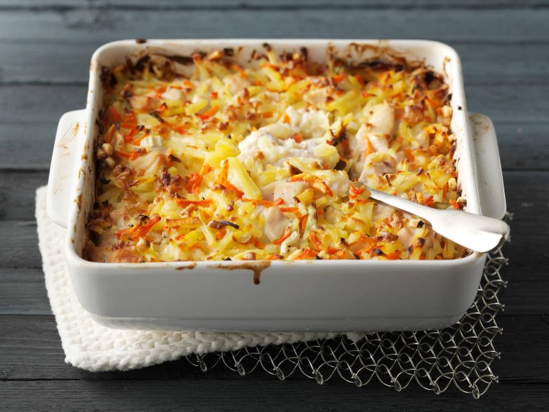 - Kypsennä 225 asteessa 20 min. Lisää vuokaan paloiteltu broileri. Upota niitä hiukan peruna-juuressekoituksen joukkoon. Alenna lämpötila 200 asteeseen. Kypsennä vielä n. 45 min.