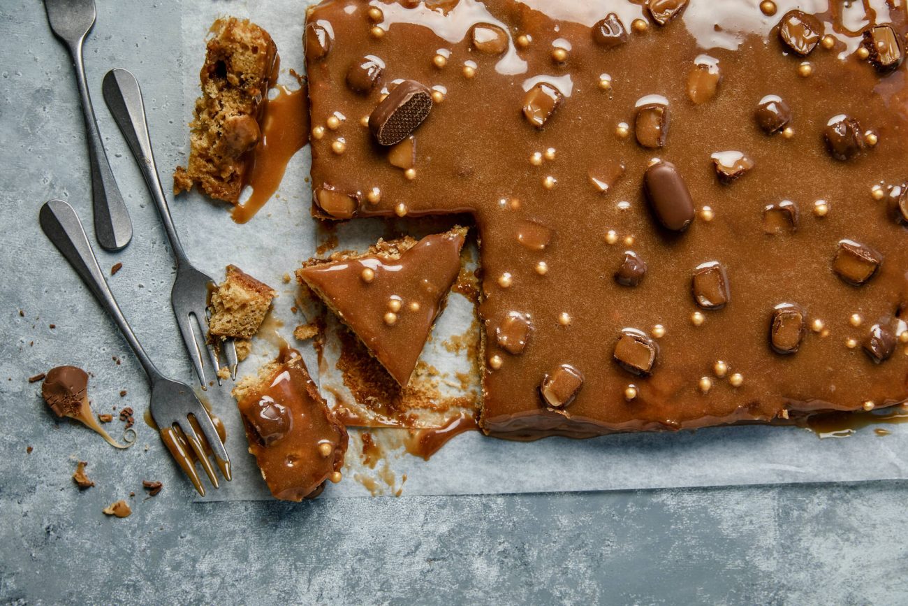 - Valmista kuorrute: Mittaa ainekset kattilaan. Sekoittele miedolla lämmöllä, kunnes makeiset ovat kokonaan sulaneet. Anna kuorrutteen jäähtyä hetki, jos se on kiehuvan kuumaa. Valuta jäähtyneen pohjan päälle.