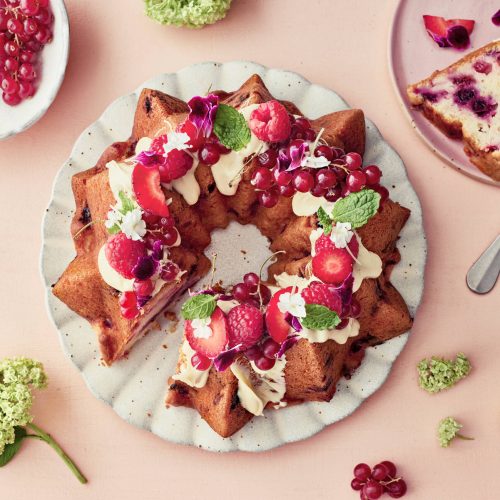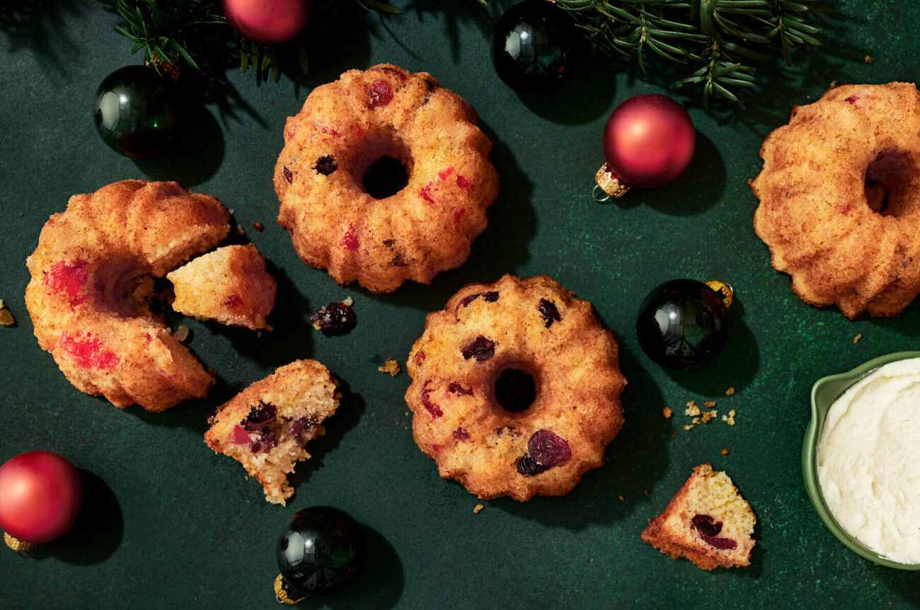 - Yhdistä jauhot, leivinjauhe ja vanijasokeri. Lisää jauhoseos vuorotellen kerman kanssa voi-sokerivaahtoon kevyesti sekoittaen. Lisää lopuksi joukkoon karpalot, sukaatit ja paloitellut kirsikat.