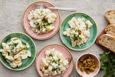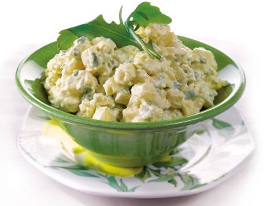 - Täytä molemmat eväsrasiat seuraavasti: Revi 1 - 2 salaatinlehteä eväsrasioiden pohjalle. Kuutioi päälle (kuoritut) perunat. Mausta kevyesti suolalla.