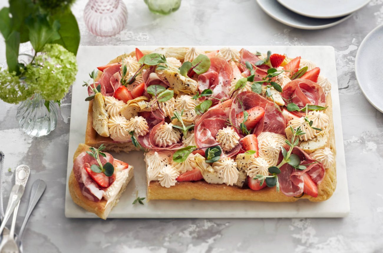 - Lisää pinnalle ilmakuivattua kinkkua, valutettua artisokkaa, mansikoita sekä tuoreita versoja.