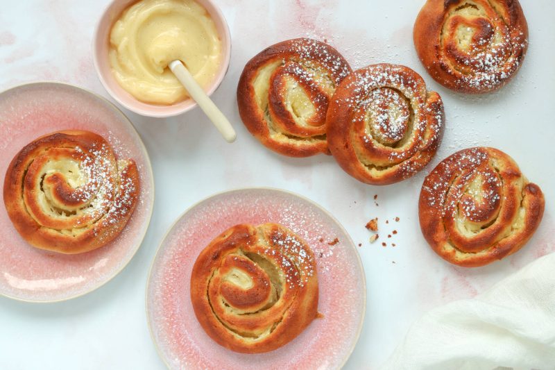 - Kauli taikinasta suorakaiteen muotoinen levy. Levitä sille vaniljarahkatäyte. Kääri taikinalevy rullaksi pitkältä sivulta, jätä saumakohta alapuolelle. Leikkaa rulla terävällä veitsellä viipaleiksi. Laita viipaleet leivinpaperille tai pullavuokiin uunipellille. Kohota liinan alla, voitele munalla.