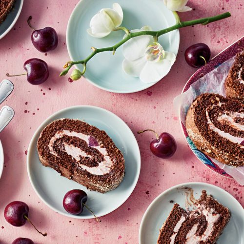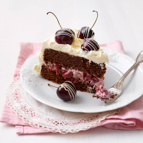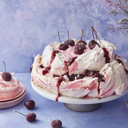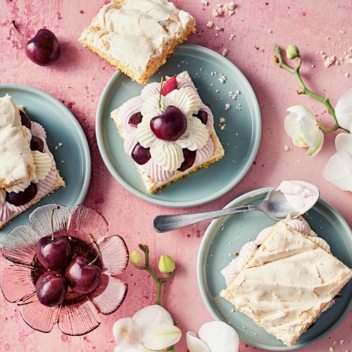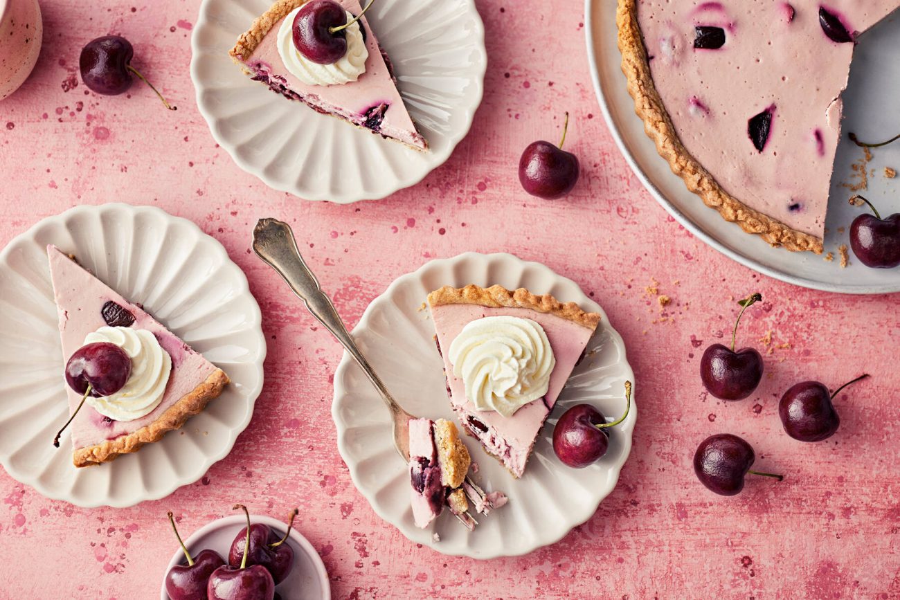 - Pursota piirakan pinnalle vaniljasokerilla maustettua kermavaahtoa ja viimeistele annokset tuoreilla kirsikoilla.