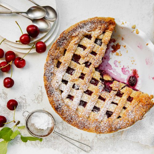 - Kaada täyte vuokaan ja ripottele loput kirsikat pinnalle.