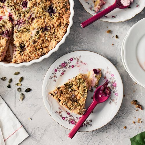 - Sekoita rahka, kerma ja muna tasaiseksi. Lisää joukkoon lähes kaikki kirsikat.