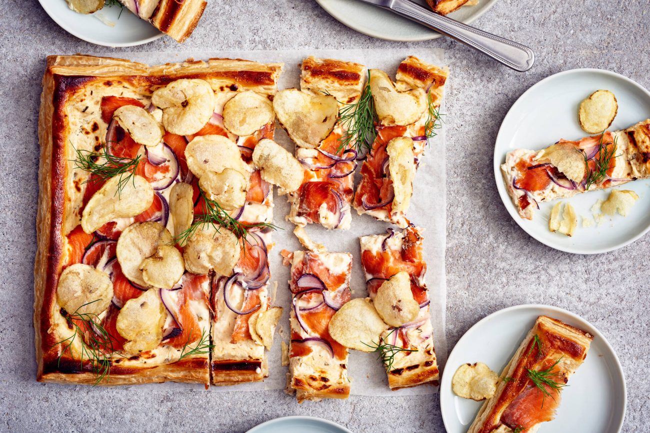 - Levitä tuorejuustot levylle viiltojen sisäpuoliseen osaan. Laita päälle kylmäsavulohta ja punasipuliviipaleita. Voitele reunat kananmunalla.