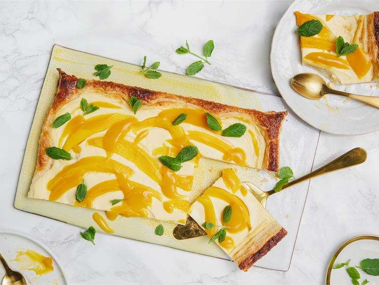 - Lusikoi jäähtyneen piiraan pintaan mangososetta ja hienonna tuoretta minttua.