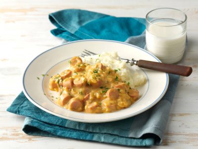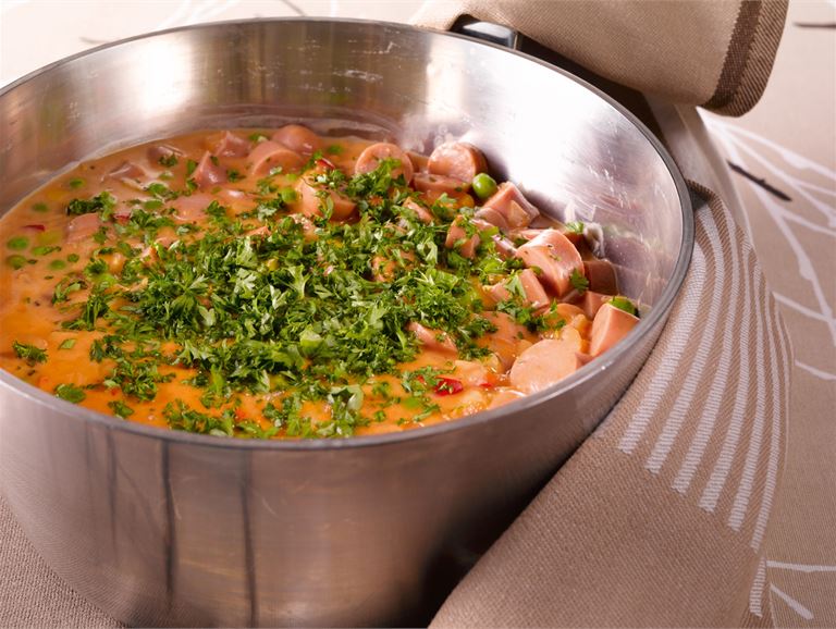 - Kuullota sipuli pannulla Oivariini rasvassa. Lisää viipaloidut nakit. Paista kunnes nakit saavat hieman väriä.
