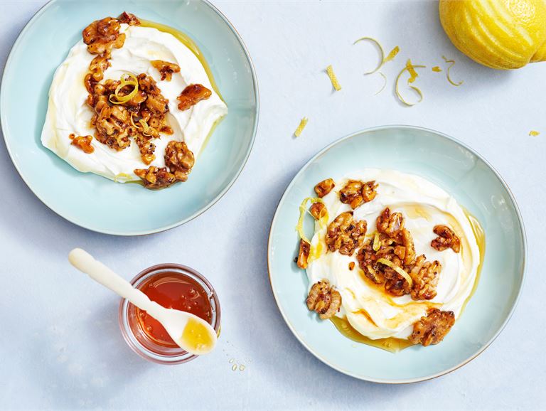 - Paahda pähkinät kuivalla pannulla. Raasta päälle sitruunankuori ja valuta loppu hunaja.