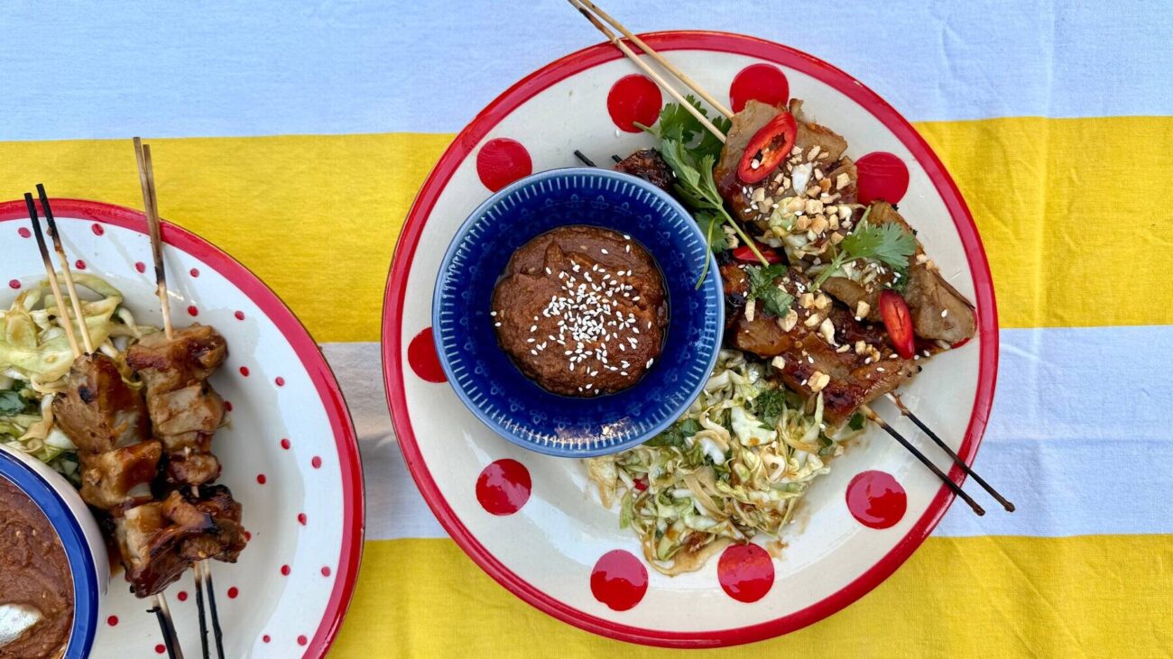 - Tarjoile vartaat kaalisalaatin ja maapähkinävoikastikkeen kanssa. Viimeistele annos pähkinämurskalla, chilisiivuilla ja lopulla korianterilla.