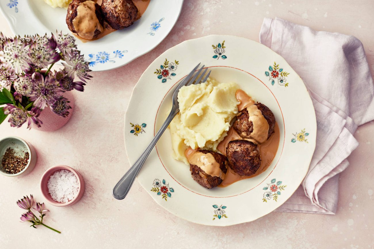 - Mittaa kattilaan tai lihapullien paistamiseen käytettyä paistinpannua (älä huuhtele makuaineita pois) kerma, vesi ja liemikuution neljännes. Kuumenna kiehuvaksi.