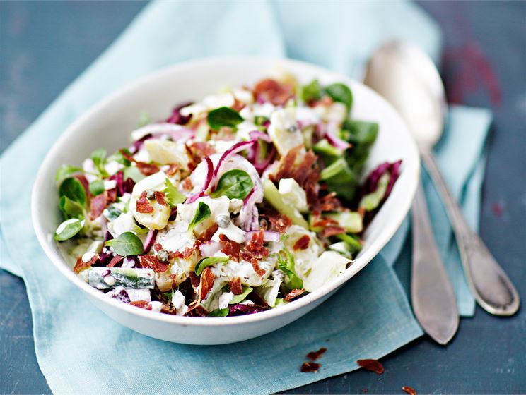 - Yhdistä perunat, kurkku-sipuliseos, kaprikset ja kastike. Sekoita varoen. Lisää halutessasi myös salaattisekoitus kevyesti nostellen.