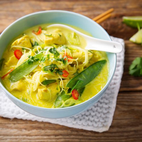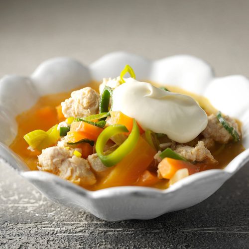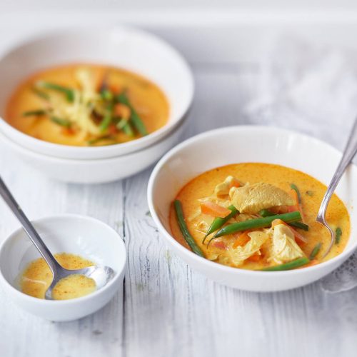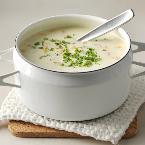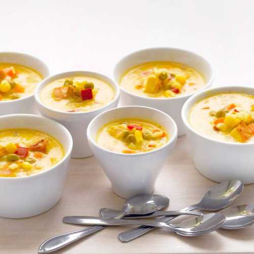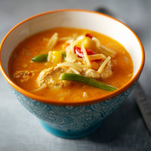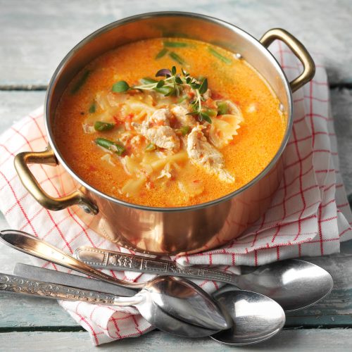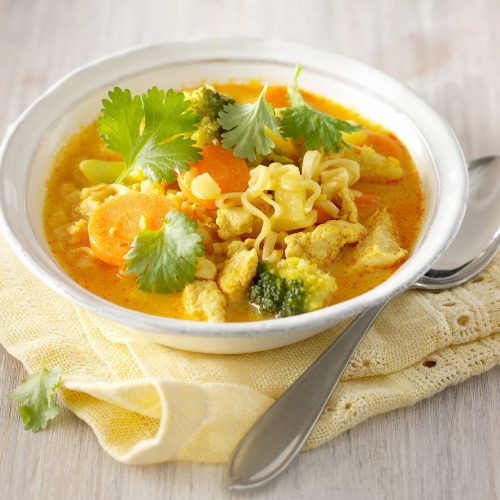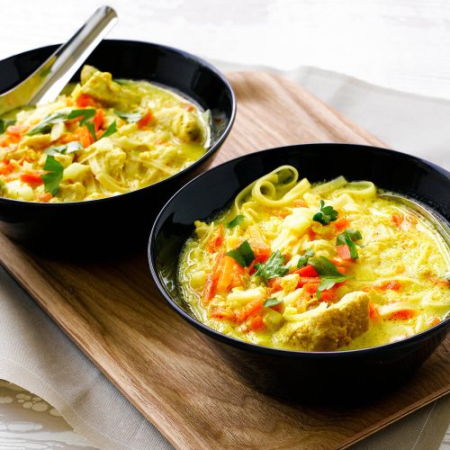 - Lisää keittoon munanuudelit ja tuorejuusto. Mausta mustapippurilla. Jatka kypsentämistä n. 5 min.