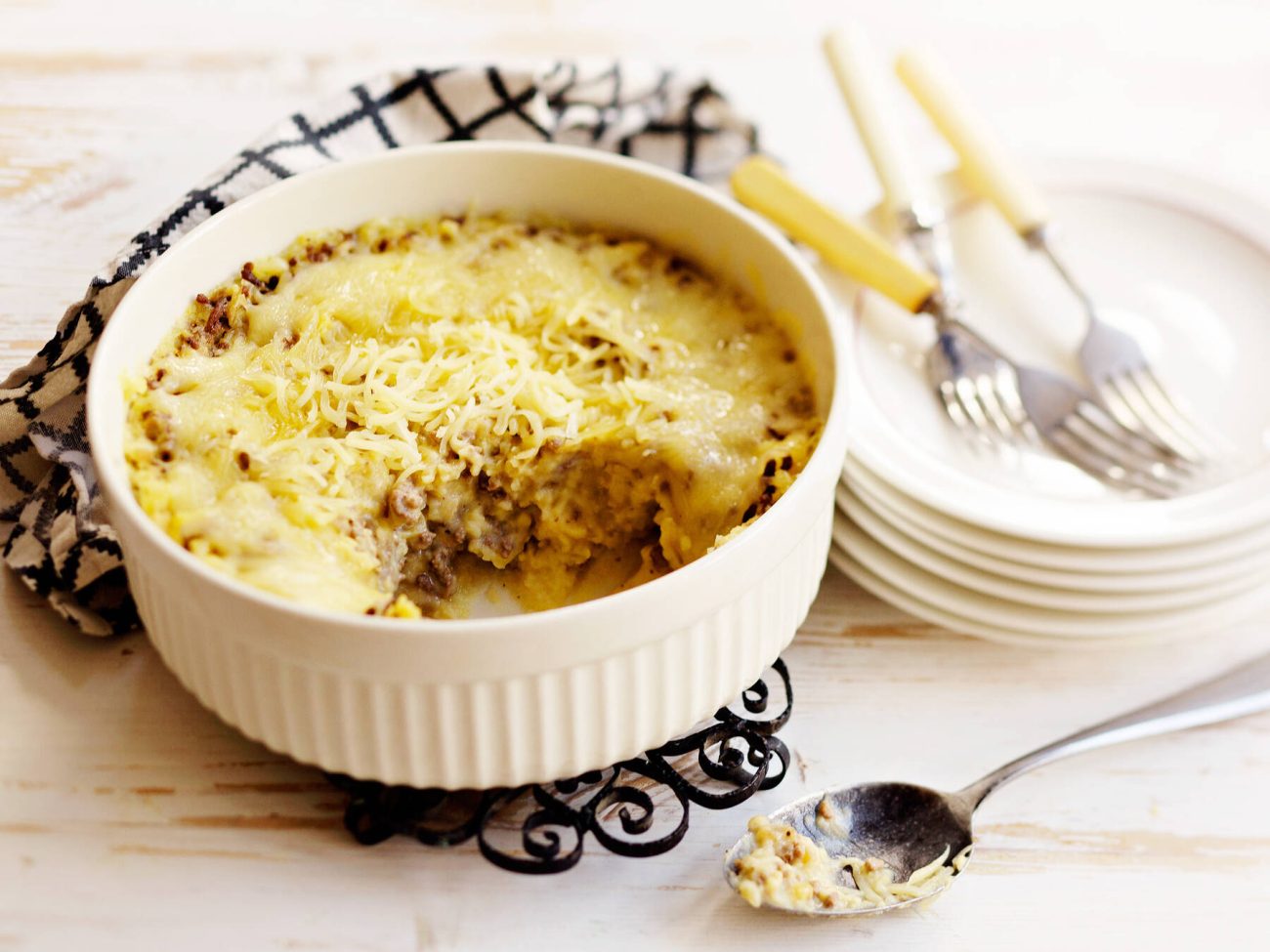 - Kaada perunasoseaines ja jauheliha kerroksittain mikronkestävään astiaan, esim. keraamiseen vuokaan.