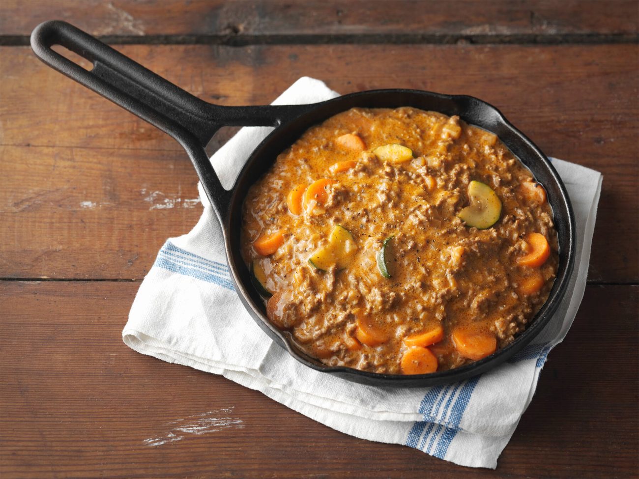 - Lisää kasvikset, lihaliemi, tomaattipyree sekä ruokakerma. Anna kiehua hiljalleen, kunnes kasvikset ovat kypsiä.