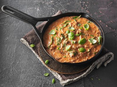 - Lisää kasvikset, lihaliemi, tomaattipyree sekä ruokakerma. Anna kiehua hiljalleen, kunnes kasvikset ovat kypsiä.