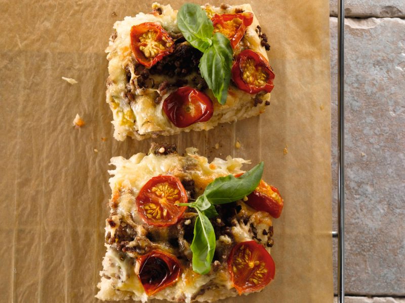 - Levitä hiukan jäähtynyt jauheliha kohonneelle pohjalle. Ripottele juustoraaste päälle. Viipaloi kirsikkatomaatit. Nostele viipaleet täytteen päälle.