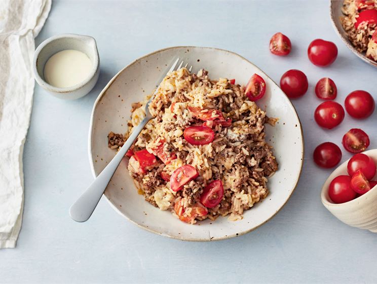 - Lisää tomaattipyree ja riisit. Sekoittele hetki.