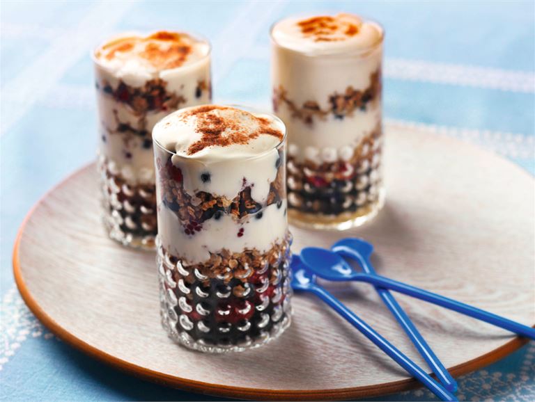 - Kokoa annokset juuri ennen tarjoilua, että kauramuru pysyy rapeana. Annostele laseihin kerroksittain hedelmäpaloja tai marjoja, kauramurua ja kastiketta. Tarjoa heti.