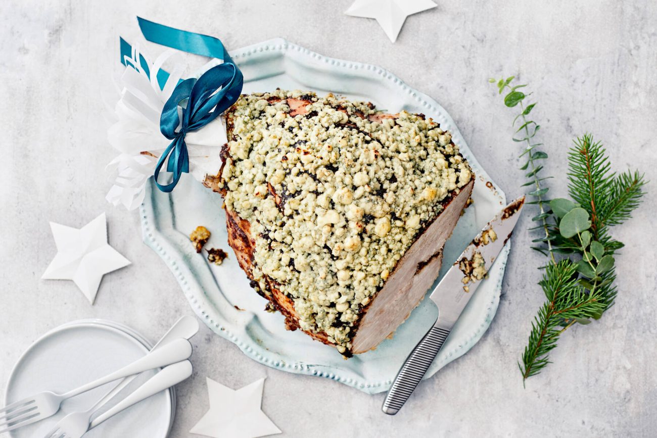 - Poista kinkusta kamara ja osa silavaa. Voitele pinta luumumarmeladilla ja ripottele päälle AURA muru.