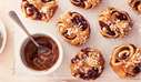 - Kauli pulla- ja piparitaikinat levyksi. Nosta päällekkäin ja kääri rullaksi. Leikkaa tangosta viipaleita ja nosta ne leivinpaperille uunipellille. Käännä rullan pää viipaleen alle. Anna kohota.